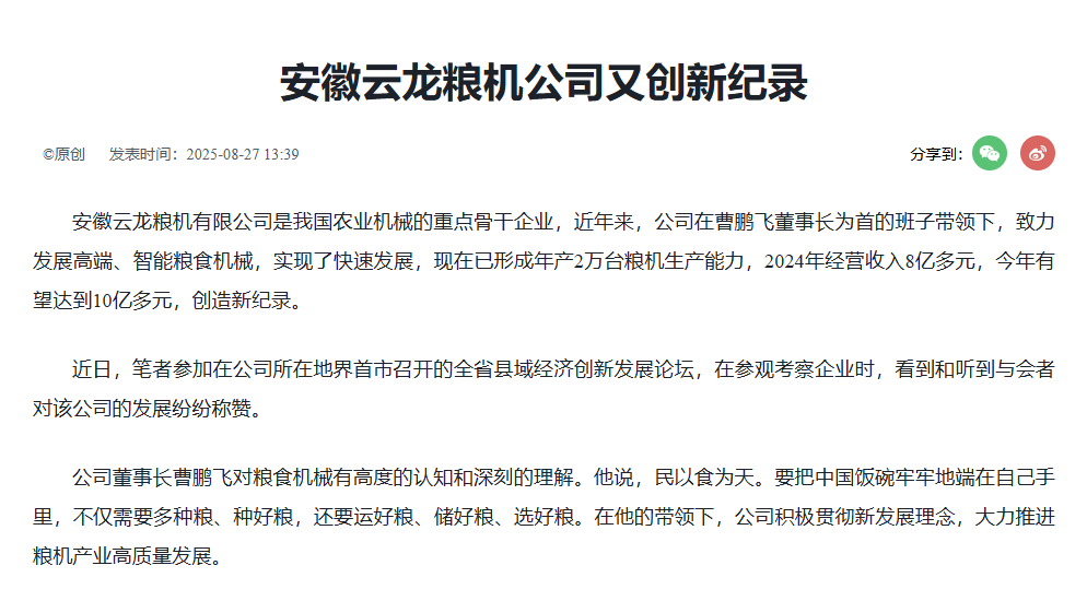 • 2025-08-29 中國工業新聞網:安徽云龍糧機公司又創新紀錄